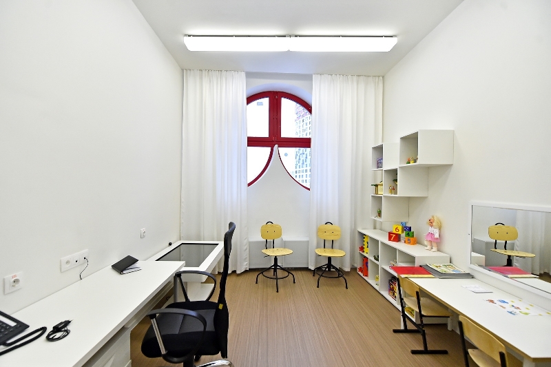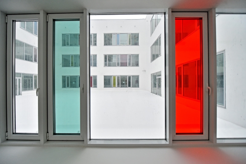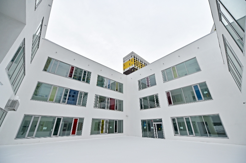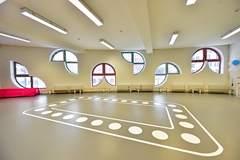В чем же особенность проекта? Основной акцент архитекторы сделали на естественном освещении, которое было реализовано с помощью фигурных окон – в форме птиц и животных – расположенных по всему периметру на разном уровне. Интерьер выполнен в скандинавском стиле – минималистичном, но с цветовыми акцентами на полу, окнах и в игровых зонах. А на крыше – выход на обзорную огороженную террасу.