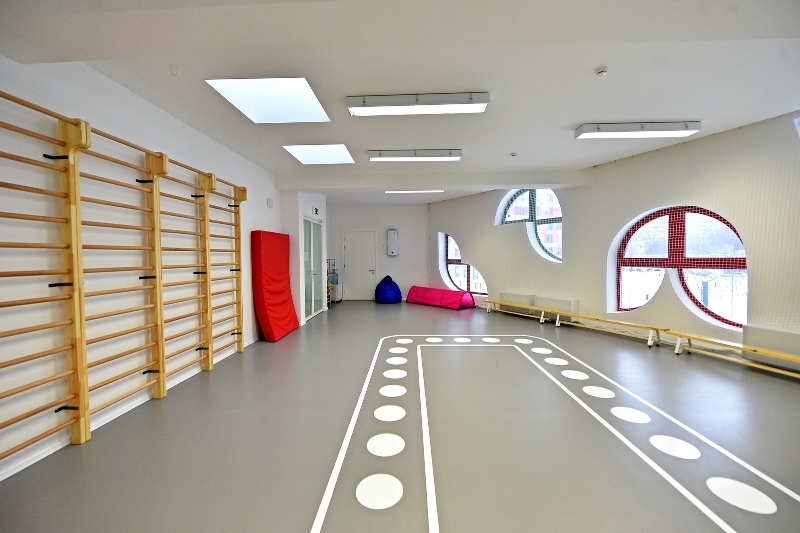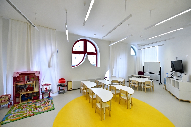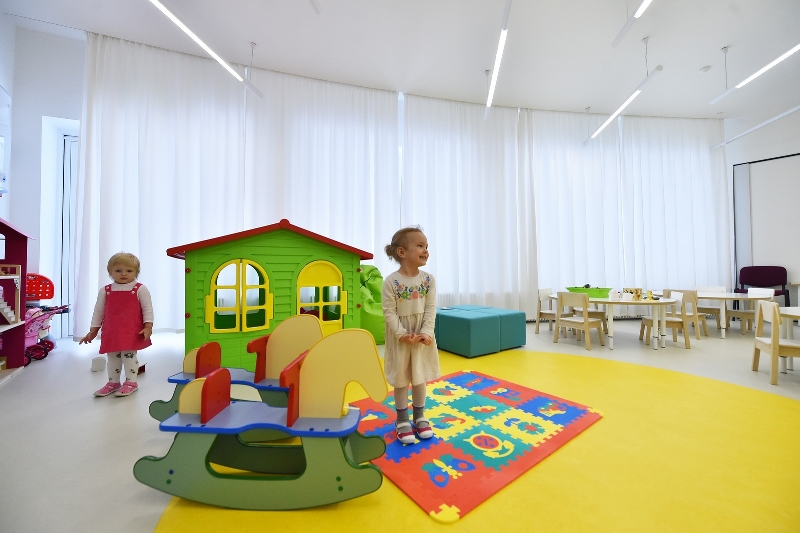Трехэтажное здание рассчитано на 9 групп по 20 человек. Детские комнаты оснащены всем необходимым: спальнями, туалетными комнатами, игровыми зонами, раздевалками, учебными досками. Распределенные по трем возрастным группам, дети смогут насыщенно проводить время в соответствии со специально составленным расписанием. Детей ждут занятия музыкой, рисование, хореография, английский язык, информатика и шахматы.