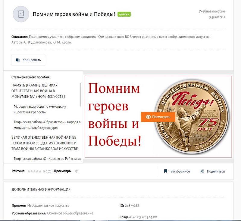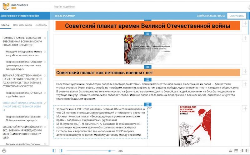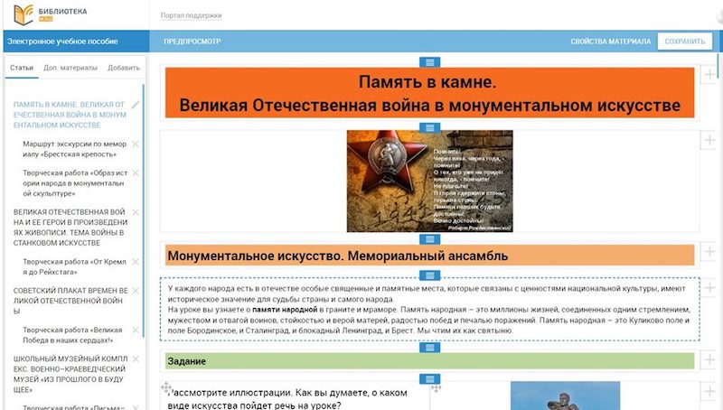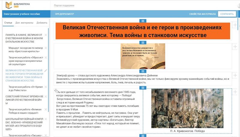Помимо этого, ЭУП состоит из параграфов «Память в камне», «Великая Отечественная война и ее герои в произведениях живописи», «Советский плакат», а также включает в себя семь творческих заданий и интерактивных вопросов. Цель контента — познакомить учащихся с образом защитника Отечества в годы войны через различные виды изобразительного творчества: монументальное и станковое, плакатное; сформировать диалогическую культуру школьников; привить умение к эмоционально-образной оценке произведений искусства и явлений жизни.