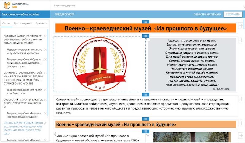Один из разделов электронного учебного пособия (ЭУП) «Помним героев войны и Победы!» «Московской электронной школы» («МЭШ»), созданный к 75-летию со дня Победы, посвятили Военно-краеведческому музею образовательного учреждения № 504 «Из прошлого в будущее» (ID:24879268 хештег #подвигввеках). Об этом корреспонденту Объединенной редакции интернет-изданий Южного округа сообщила сотрудница школы Юлия Кроль.