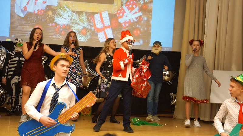 Седьмые и восьмые классы поучаствовали в конкурсе «Новогодний калейдоскоп» — в нем школьникам нужно было инсценировать песни.
